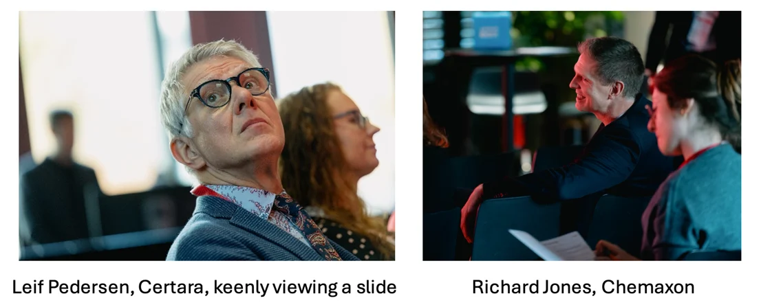 The production mixed the pizzazz and dynamism of a typical Chemaxon meeting with the carefully curated content of Certara meetings. Both the now-united companies brought something unique in terms of science and organization. Last year’s Chemaxon color theme was magenta, this year it was scarlet for a red-hot meeting. Yet again, the speakers were welcomed to the stage with fanfares signaling the appearance of celebrities. There were cameras everywhere, and afterwards, I was supplied with hundreds of superb hi-res photographs from which to choose the graphics in this article. Last year, the speakers got framed photographs of themselves. This year, they got special conference bags ablaze with their mugshots. The Catch Box mic was also in evidence.