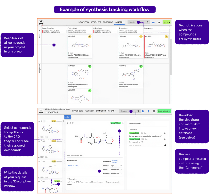 Depending on the level of collaboration, the CRO can also use this tool to track assay requests or add their own designed compounds to the KanBan board