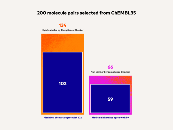 We gave these 200 molecule pairs to 6 medicinal chemists, and asked them to judge if – according to the “substantially similar” term – should the input structure be considered controlled knowing that the other structure is listed as controlled?”