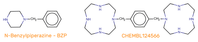 In Compliance Checker, the detection of highly similar molecules applies a fragment-based pharmacophore fingerprint for this purpose. Pharmacophore fingerprints focus on functional similarities rather than strict structural equivalence, identifying key functional groups such as hydrogen bond donors and acceptors, aromatic rings, and hydrophobic regions. Based on the analysis of the hits in the ChEMBL dataset, the functional group definitions have been optimized, and the three fingerprint representations form a consensus model that can reliably identify molecule structures highly similar to directly controlled substances in the US and Canada.