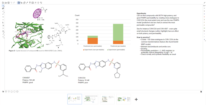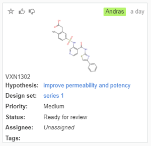 Figure 2. Example of a hypothesis canvas using pictures, structures and text. Once the hypothesis is shared with the team, the designed compounds can be refined by colleagues, and additional examples added on the same theme. The synthetic routes can be saved and connected to the design sets.