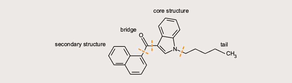 in that the four substructures, that is to say the indole ring, the pentyl substituent, the methanone linking group and the naphthyl ring, are linked together in a similar manner, whether or not any of the sub-structures have been modified, and whether or not substituted in any of the linked substructures with one or more univalent substituents and, where any of the sub-structures have been modified, the modifications of the sub-structures are limited to any of the following, that is to say—