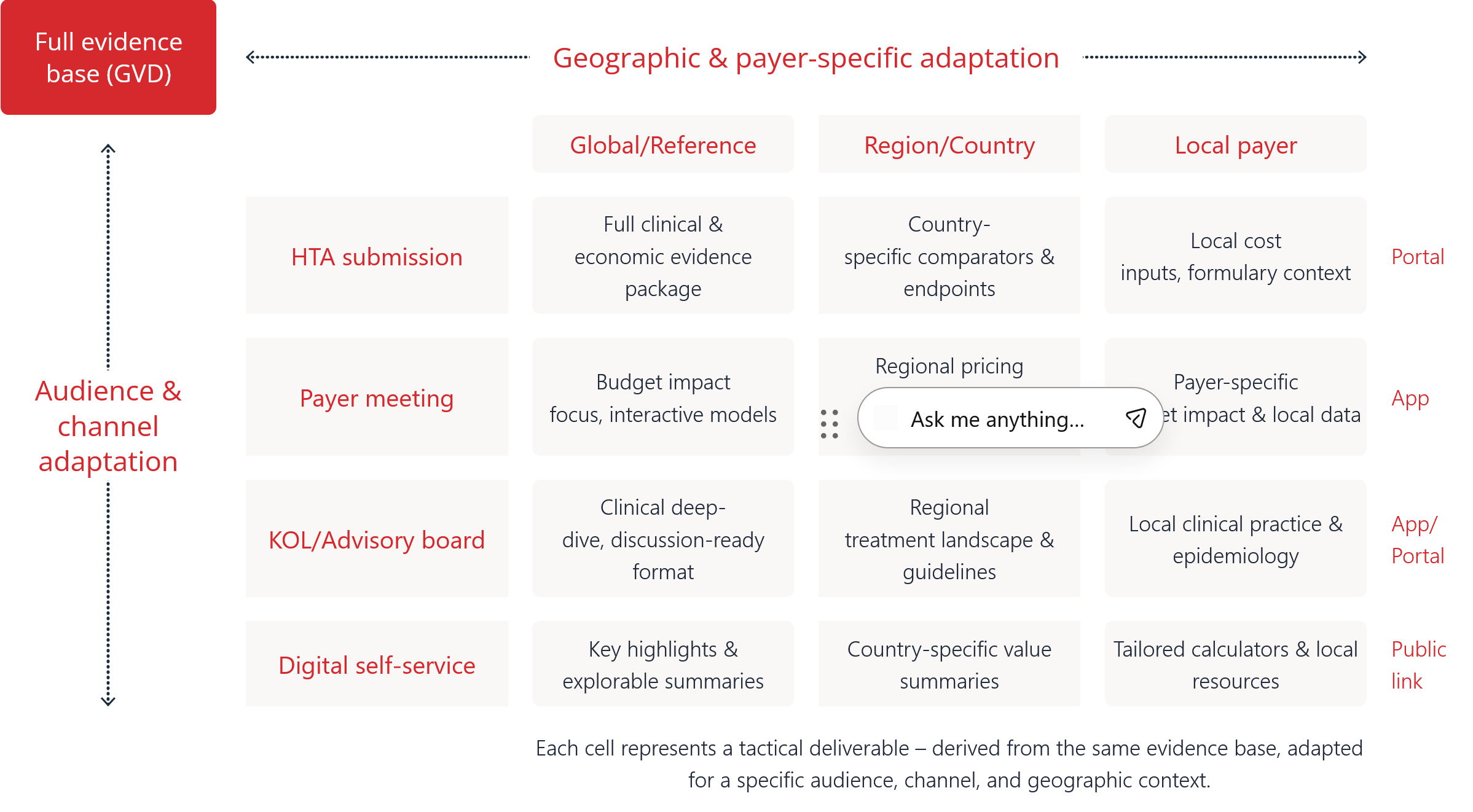Local affiliates can adapt the GVD to meet country-specific requirements, such as HTA submissions or reimbursement dossiers. While the global narrative remains consistent, elements like comparator data, epidemiology, and cost inputs can be tailored. This ensures alignment with local payer expectations while maintaining a unified global value story.