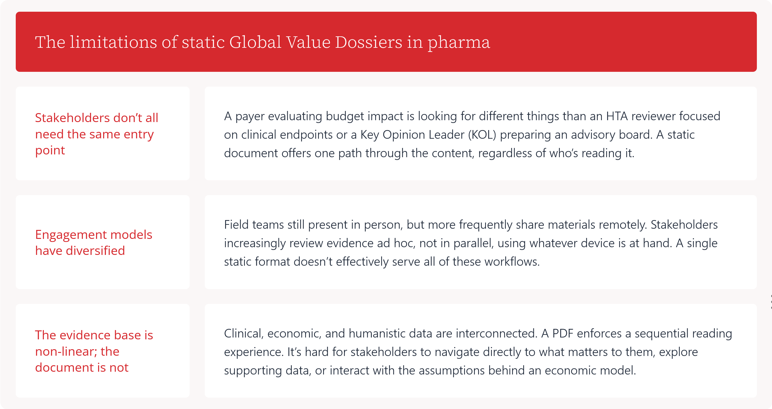 A payer evaluating budget impact is looking for different things than an HTA reviewer focused on clinical endpoints or a Key Opinion Leader (KOL) preparing an advisory board. A static document offers one path through the content, regardless of who’s reading it.