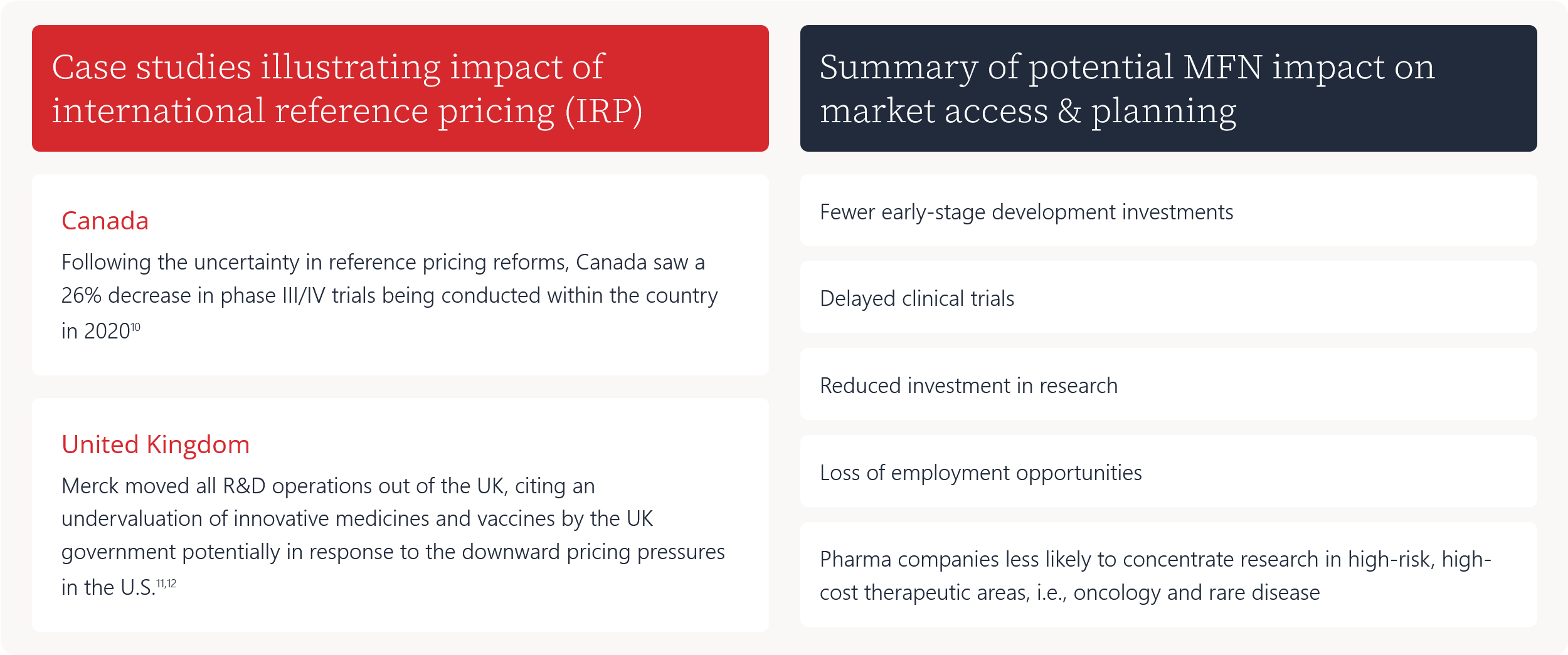 Merck moved all R&D operations out of the UK, citing an undervaluation of innovative medicines and vaccines by the UK government potentially in response to the downward pricing pressures in the U.S.11,12